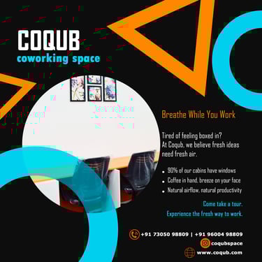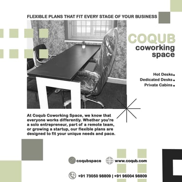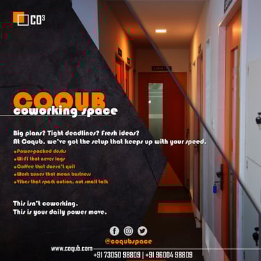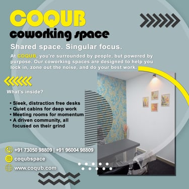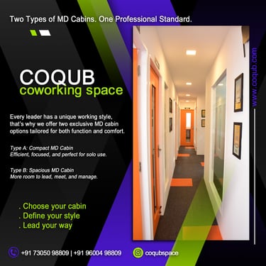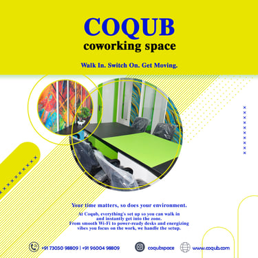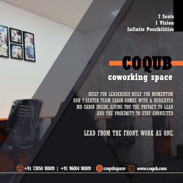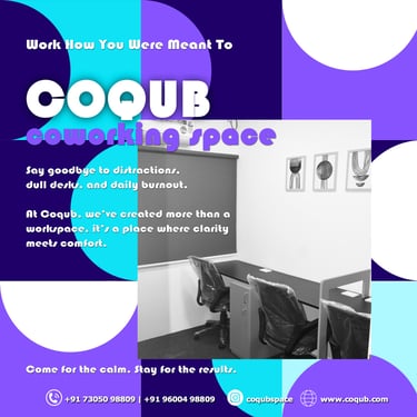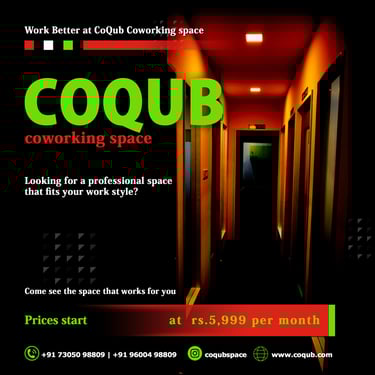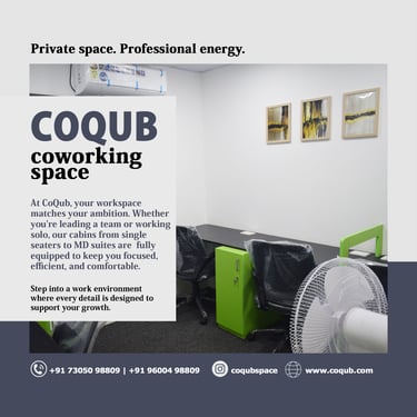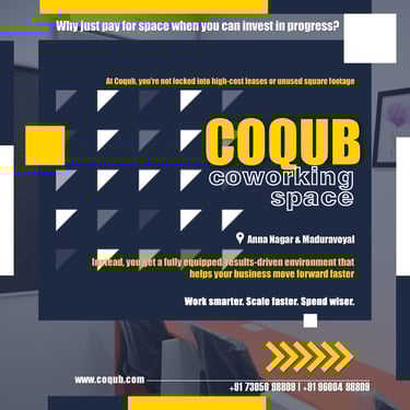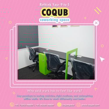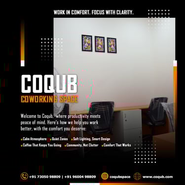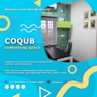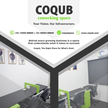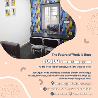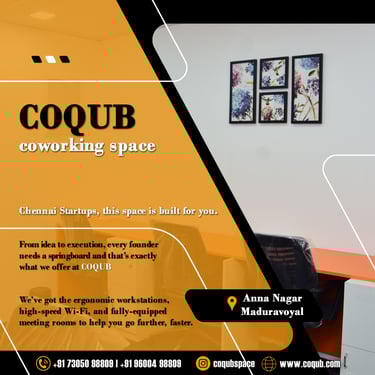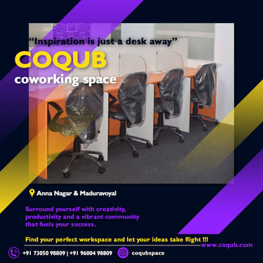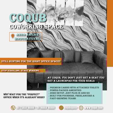 COQUB 1.0 is a modern coworking space located in the heart of Maduravoyal, offering excellent connectivity to Porur, Koyambedu, Valasaravakkam, Nerkundram, Mogappair, Ambattur, and Poonamallee. Designed for freelancers, startups, and growing business teams, the space features fully furnished 1,2,3,5 and 7 seater private offices, private MD cabins, and flexible coworking desks. With high-speed internet, meeting facilities, and a focused professional environment, COQUB 1.0 provides an ideal workspace for productivity, collaboration, and business growth.